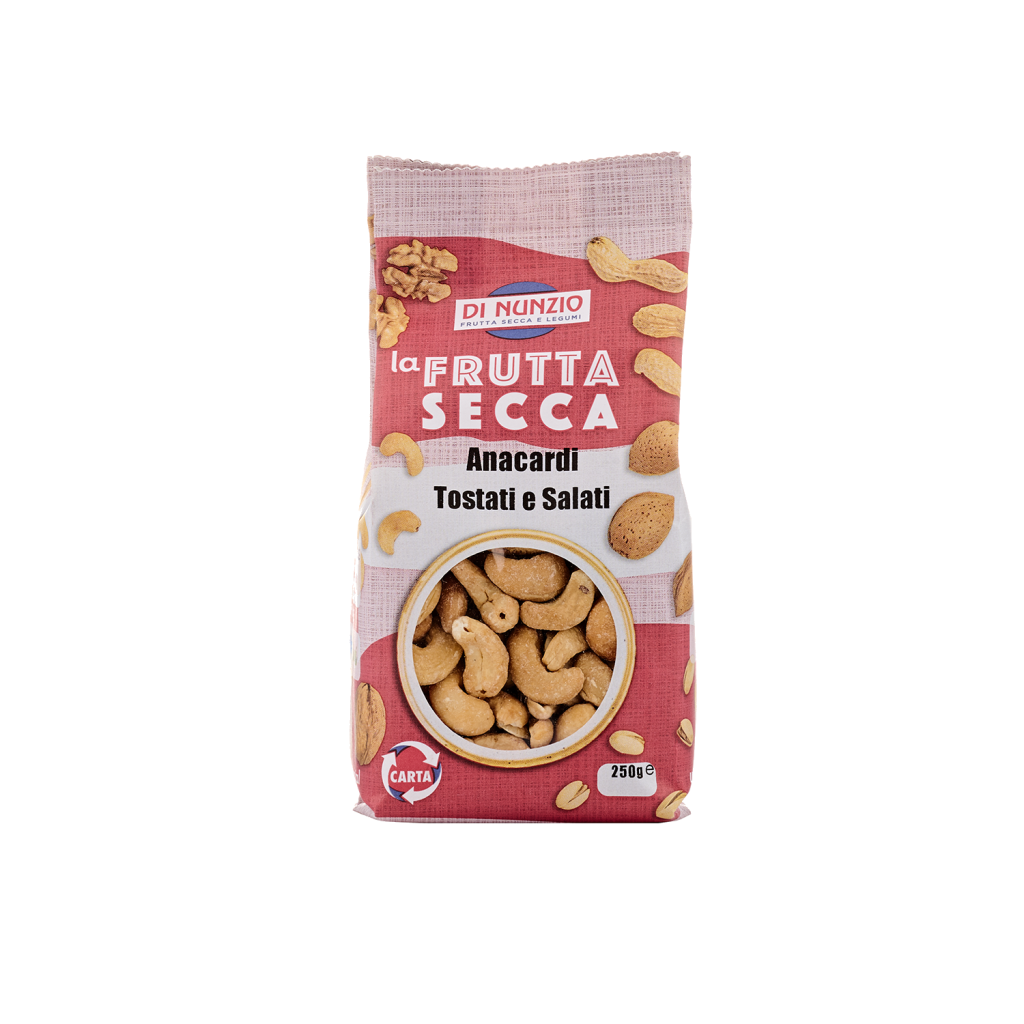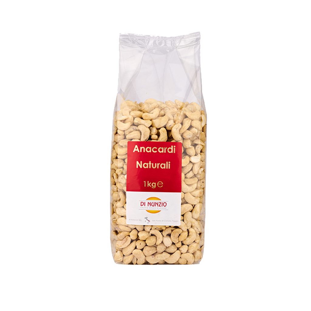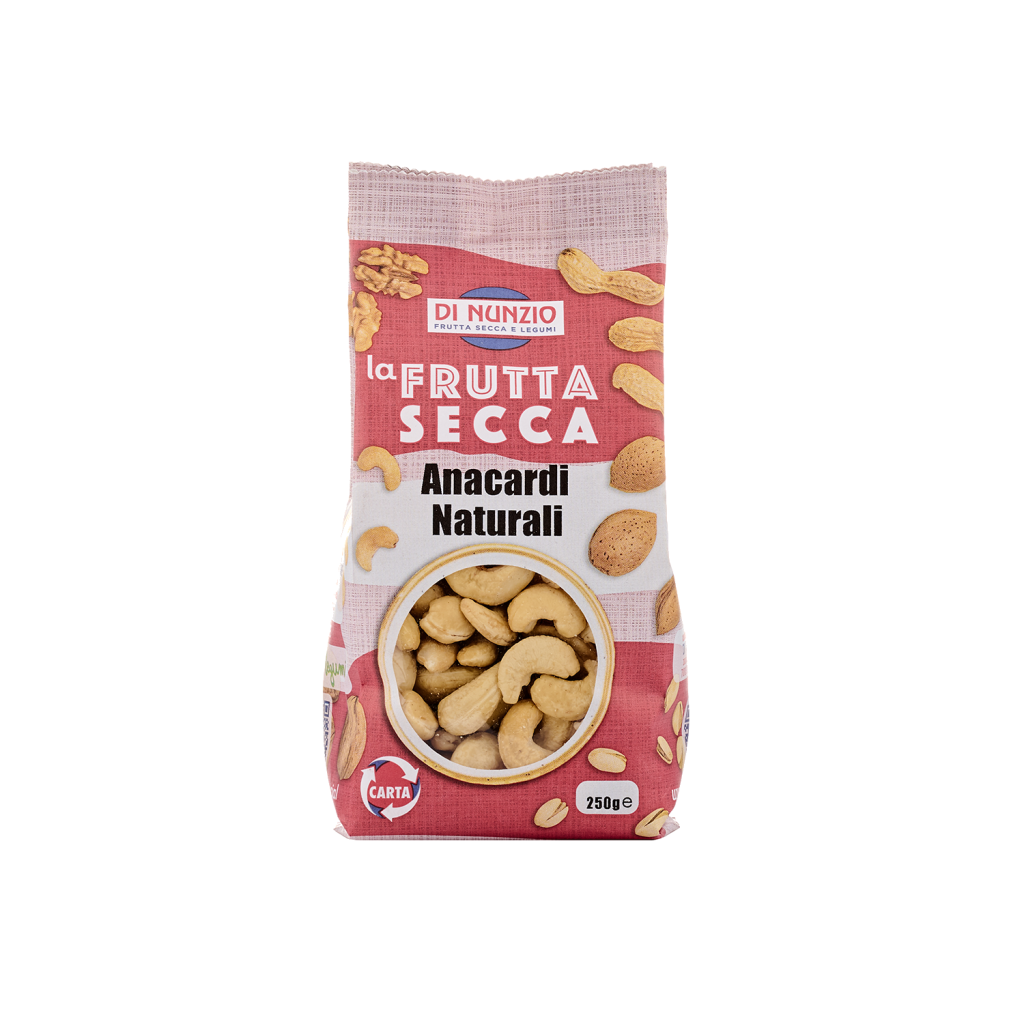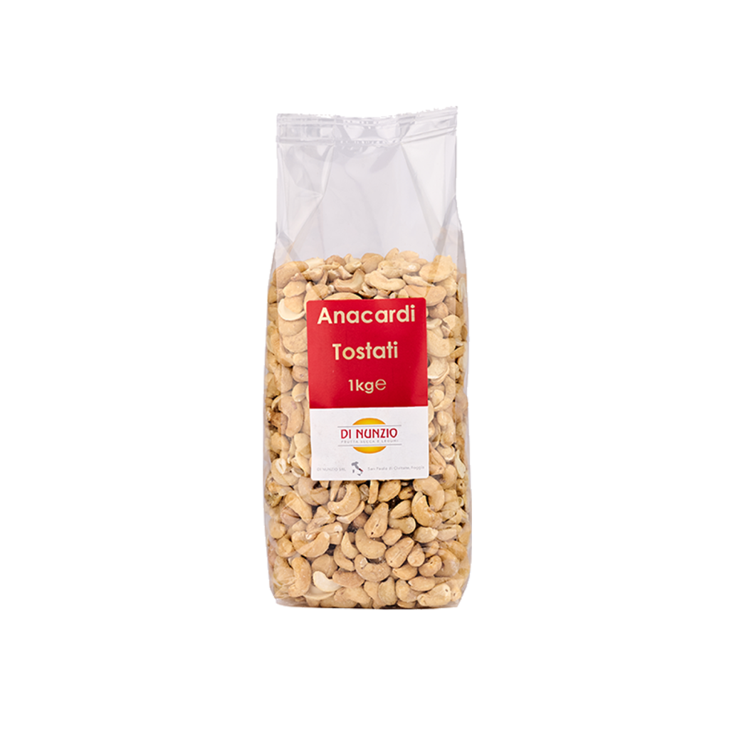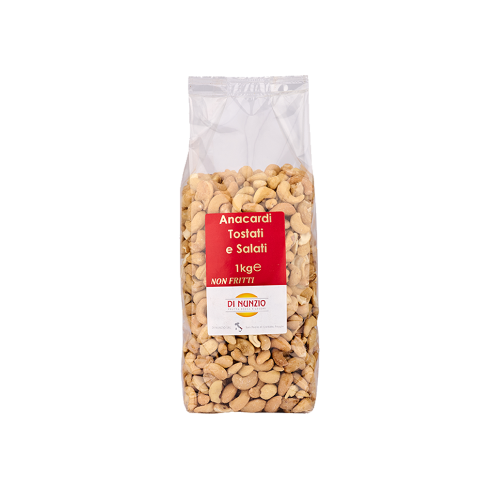 Gli anacardi hanno una consistenza morbida e un sapore unico. Contengono meno grassi rispetto  ad altri tipi di frutta secca. Inoltre sono ricchi di grassi monoinsaturi e quindi “buoni”.Gli anacardi  tostati e salati Di Nunzio subiscono un trattamento di lenta tostatura e salatura con  raffreddamento a basse temperature che ne garantisce la croccantezza e il massimo del gusto.  Ottimi da gustare ad un aperitivo raffinato oppure come spezzafame durante la mattinata.