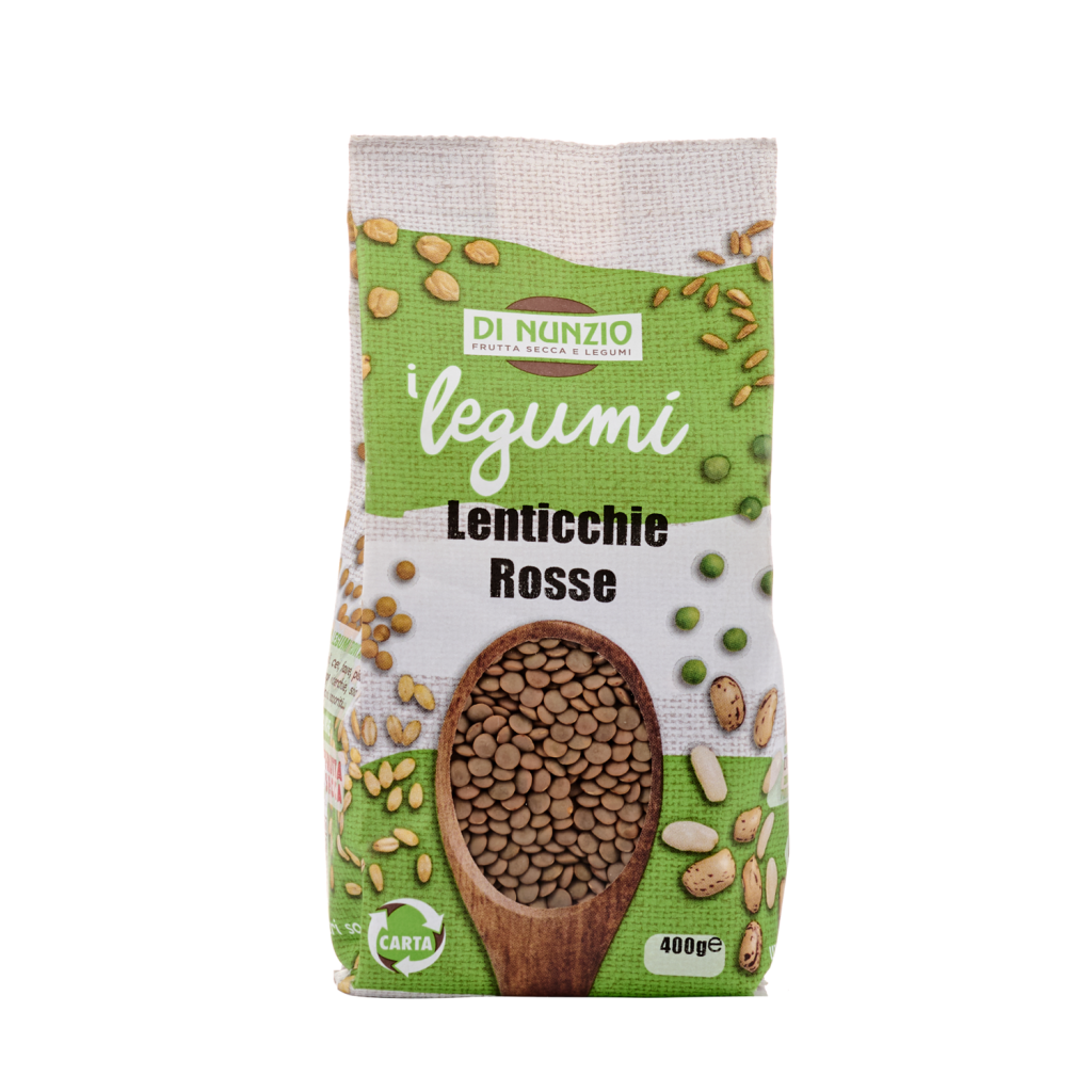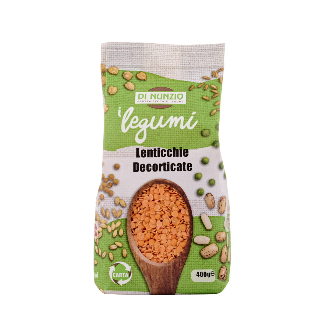 Le lenticchie rosse decorticate sono private della buccia, quindi molto più digeribili. Prolungando la cottura si trasformano in una morbida crema ottima per lo svezzamento dei bambini, per purè o vellutate ma anche come ripieno di tortelli e ravioli.Lens culinaris è una pianta dicotiledone della famiglia delle Fabaceae (o Leguminose) detta lenticchia, coltivata sin dall’antichità. È una pianta annuale, i cui frutti sono dei legumi che contengono due semi rotondi appiattiti, commestibili, ricchi di proteine e ferro, noti come lenticchie con diverse varietà, particolarmente apprezzati in Europa, anche se la produzione mondiale non è elevata ma in continua crescita. Di norma le lenticchie estere importate dalla Di Nunzio provengono dal Canada, da aziende selezionate negli anni . La Lenticchia decorticata subisce un procedimento di abrasione della cuticola esterna per far sì che il prodotto cuocia prima e sia più digeribile.