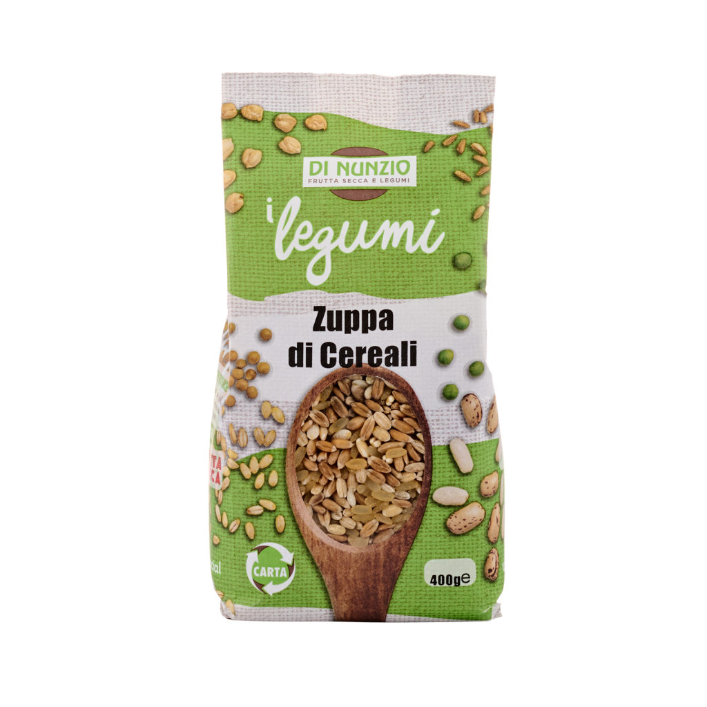 La zuppa di cereali Di Nunzio viene creata in base ad una ricetta selezionata in un contest dove più di 30 signore hanno espresso il loro gradimento per le varie ricette presentate. La zuppa è composta da Orzo perlato, Farro Perlato e Riso Integrale.La zuppa di cereali Di Nunzio viene creata in base ad una ricetta selezionata in un contest dove più di 30 signore hanno espresso il loro gradimento per le varie ricette presentate. La zuppa è composta da Orzo perlato, Farro Perlato e Riso Integrale. In questo modo tutti e tre i prodotti cuociono contemporaneamente e non c’è difformità di tasting al palato. Utilizzabile per ricette estive e creative e come facile sostituto della pasta.