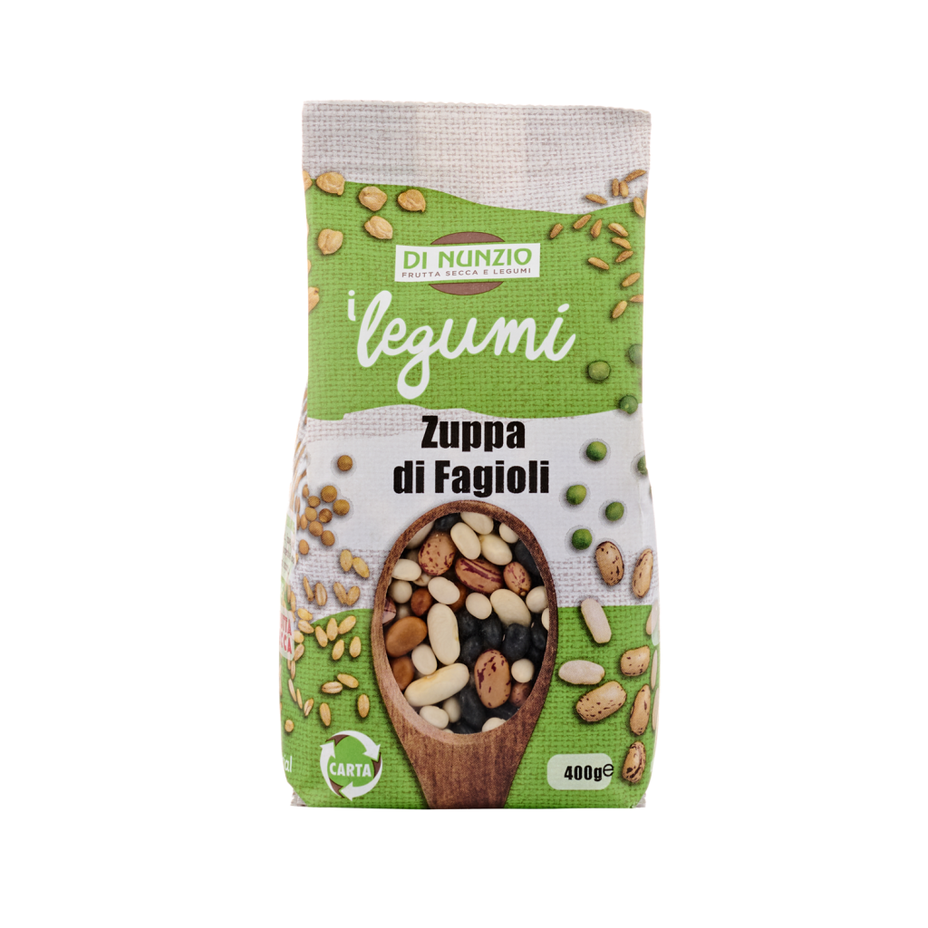 La zuppa di Fagioli si compone di Fagioli Borlotti, Fagioli Cannellini, Fagioli Bruni, Fagioli Neri e Fagioli Tondini.La zuppa di fagioli Di Nunzio viene creata in base ad una ricetta selezionata in un contest dove più di 30 signore hanno espresso il loro gradimento per le varie ricette presentate. La zuppa di Fagioli si compone di Fagioli Borlotti, Fagioli Cannellini, Fagioli Bruni, Fagioli Neri e Fagioli Tondini. Il tutto per una esplosione di gusto incredibile.