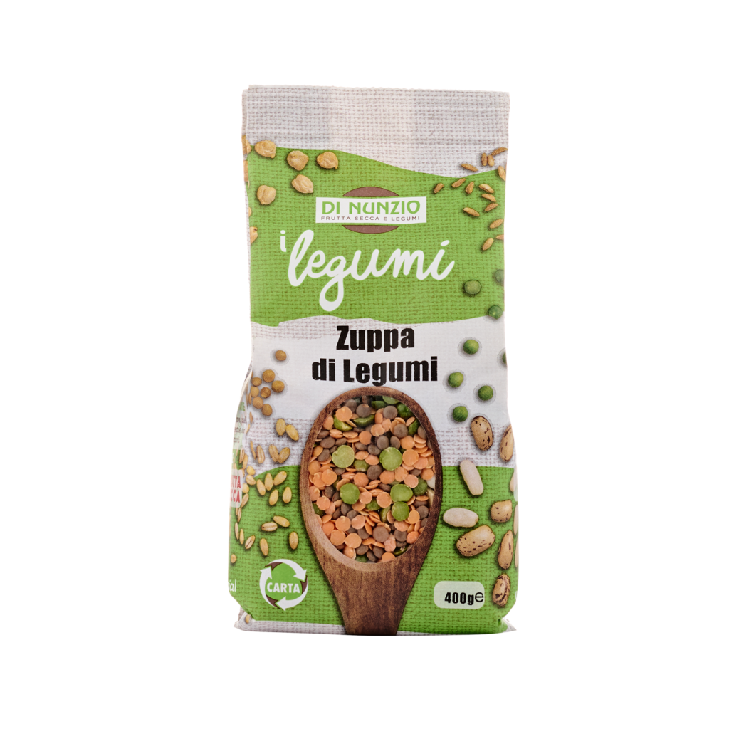 La zuppa di legumi Di Nunzio è composta da: lenticchie decorticate, fave sgusciate, piselli spezzati, lenticchie rosse, fagioli tondini. Il risultato è una crema di sapori molto avvolgente e saporita. La zuppa di legumi Di Nunzio viene creata in base ad una ricetta selezionata in un contest dove più di 30 signore hanno espresso il loro gradimento per le varie ricette presentate. La selezione dei legumi è stata sapientemente fatta per garantire pari cottura di tutti i legumi presenti, senza trovarsi legumi più duri e legumi più pastosi allo stesso tempo. Infatti gli ingredienti sono: Lenticchie decorticate, fave sgusciate, piselli spezzati, lenticchie rosse, fagioli tondini. Il risultato è una crema di sapori molto avvolgente e saporita.